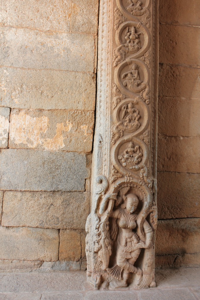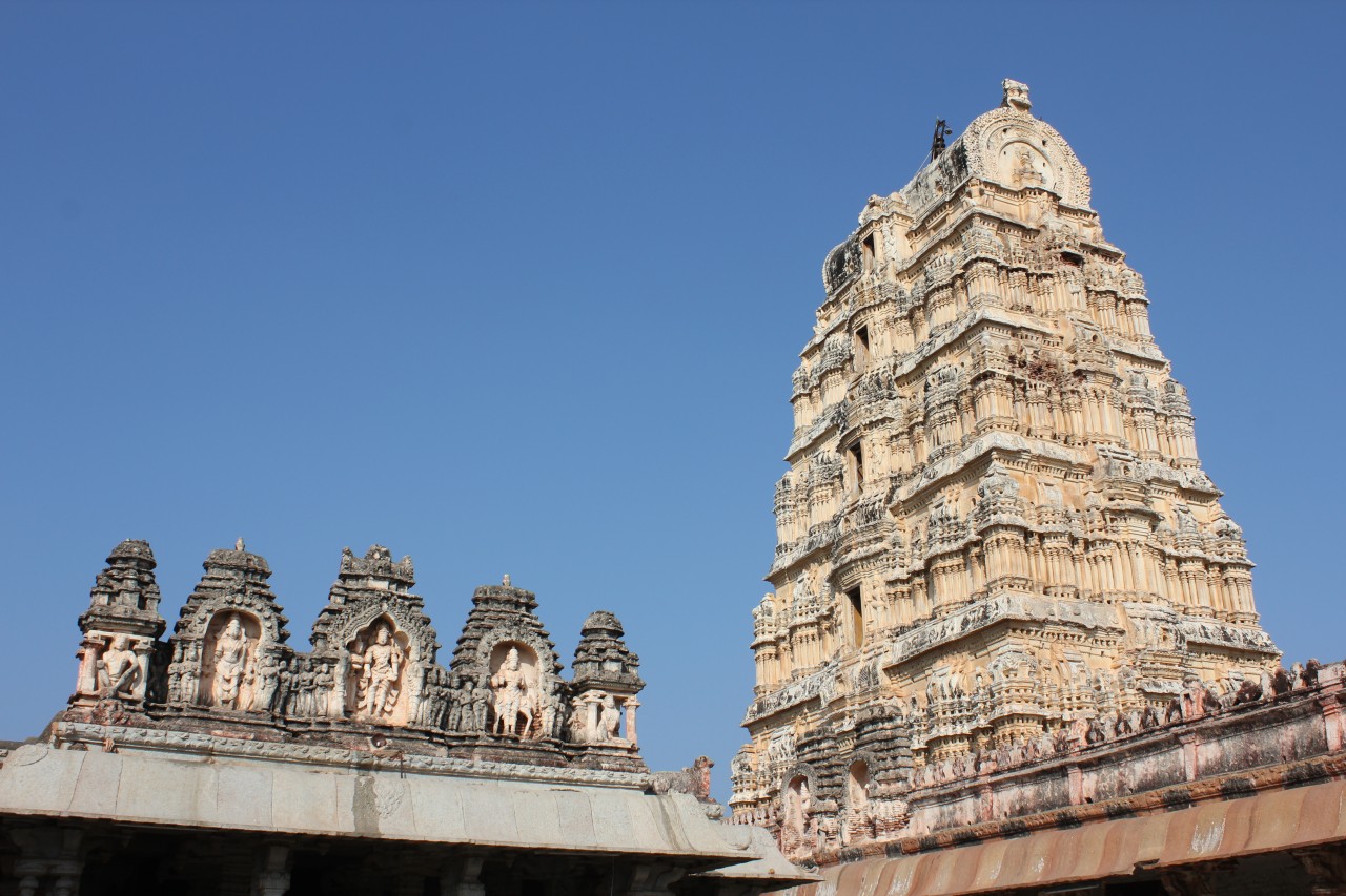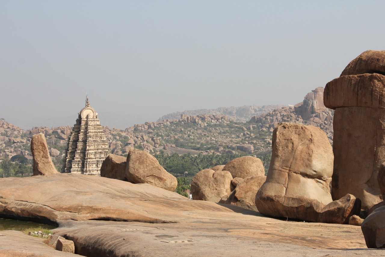 Gyors reggeli (egy banánturmix) után a Virupaksha templomnál folytattuk a nézelődést. Itt le kellett venni a cipőt, így jól jött a direkt erre a célra hozott plusz zokni. A templomban rengeteg majom lakik, akiket naponta háromszor etetnek 10-10 kg rizzsel. A majmok nem voltak túl szimpik, főleg azután nem, hogy az egyik rám ugrott hátulról, majd elcsórta a fejemről sapkámat. Szerencsére nem ment messzire vele, csócsált rajta egyet majd miután az őrök megijesztették ledobta a földre. Azért biztos ami tuti jól befújtam alkoholos fertőtlenítővel.