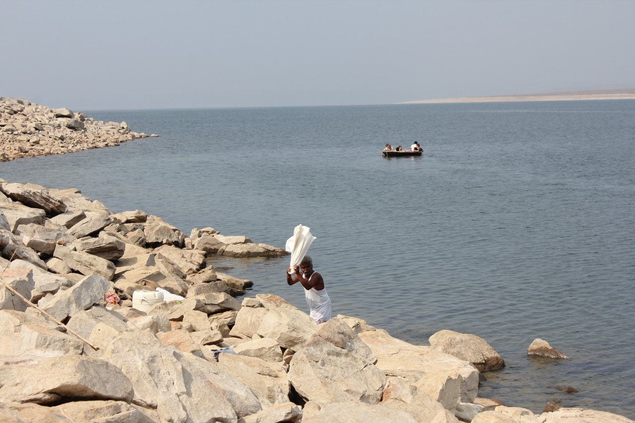 A vízparton egy ember mosott, szép ütemet adott ahogy ütötte a nagy adag fehér anyagot a kövekhez. Mire megjártuk a szigetet, már rengeteg színes anyag száradt a köveken.