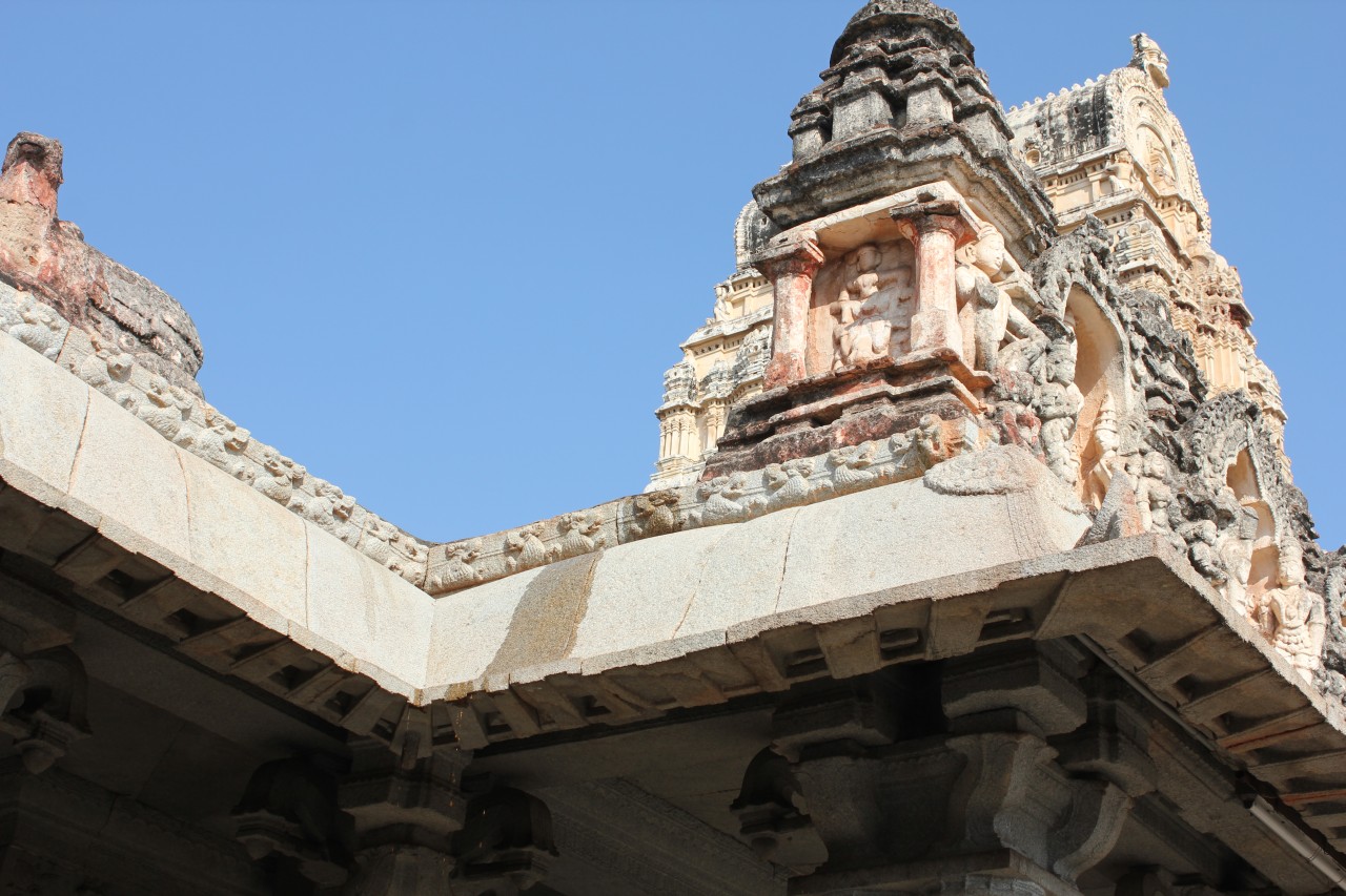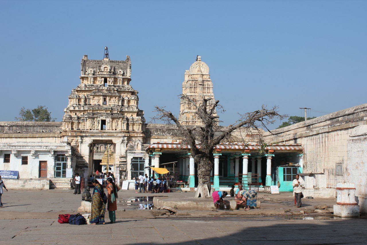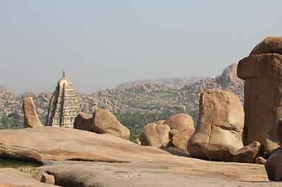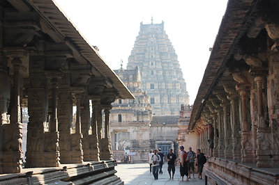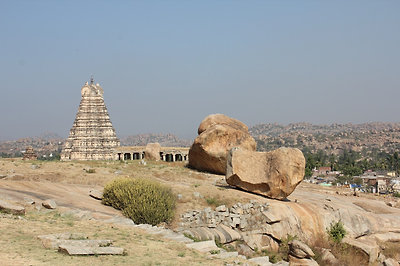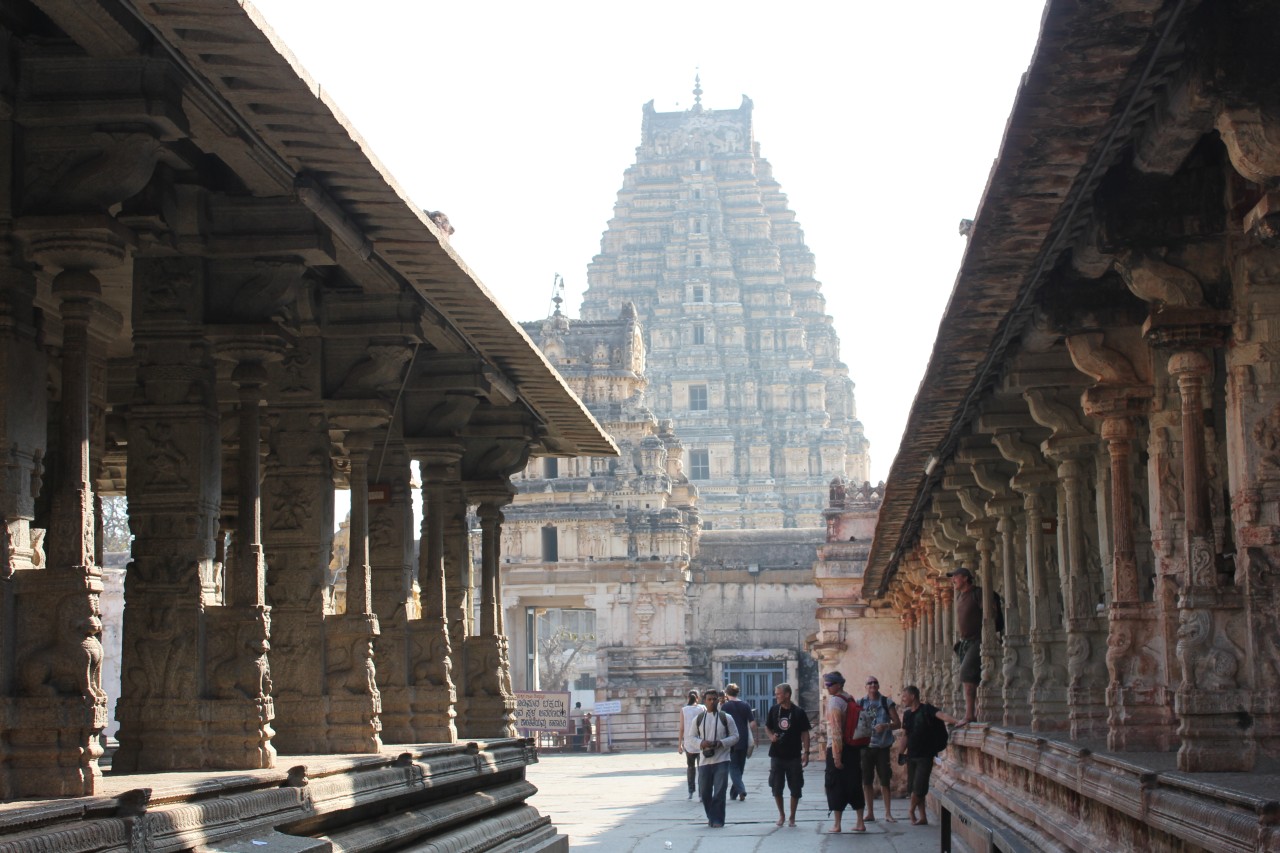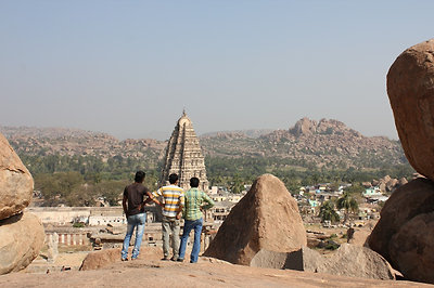 Gyors reggeli (egy banánturmix) után a Virupaksha templomnál folytattuk a nézelődést. Itt le kellett venni a cipőt, így jól jött a direkt erre a célra hozott plusz zokni. A templomban rengeteg majom lakik, akiket naponta háromszor etetnek 10-10 kg rizzsel. A majmok nem voltak túl szimpik, főleg azután nem, hogy az egyik rám ugrott hátulról, majd elcsórta a fejemről sapkámat. Szerencsére nem ment messzire vele, csócsált rajta egyet majd miután az őrök megijesztették ledobta a földre. Azért biztos ami tuti jól befújtam alkoholos fertőtlenítővel.