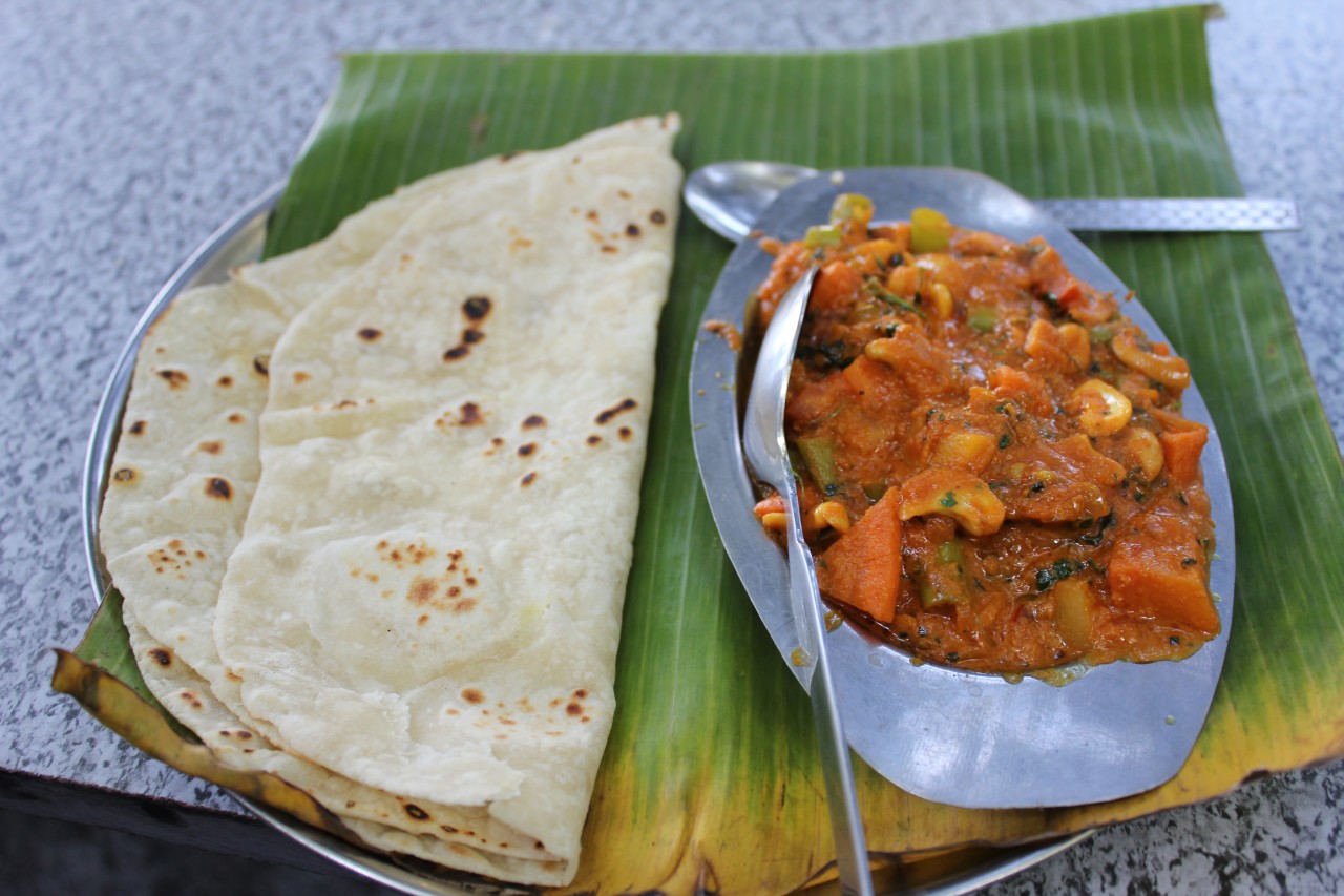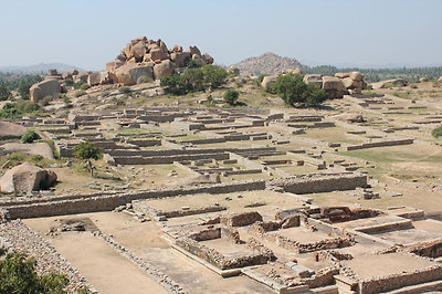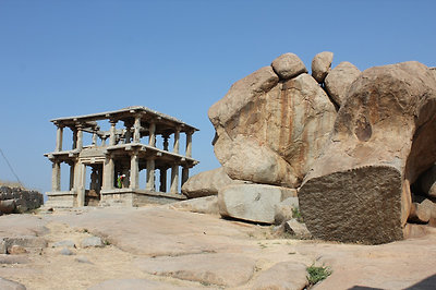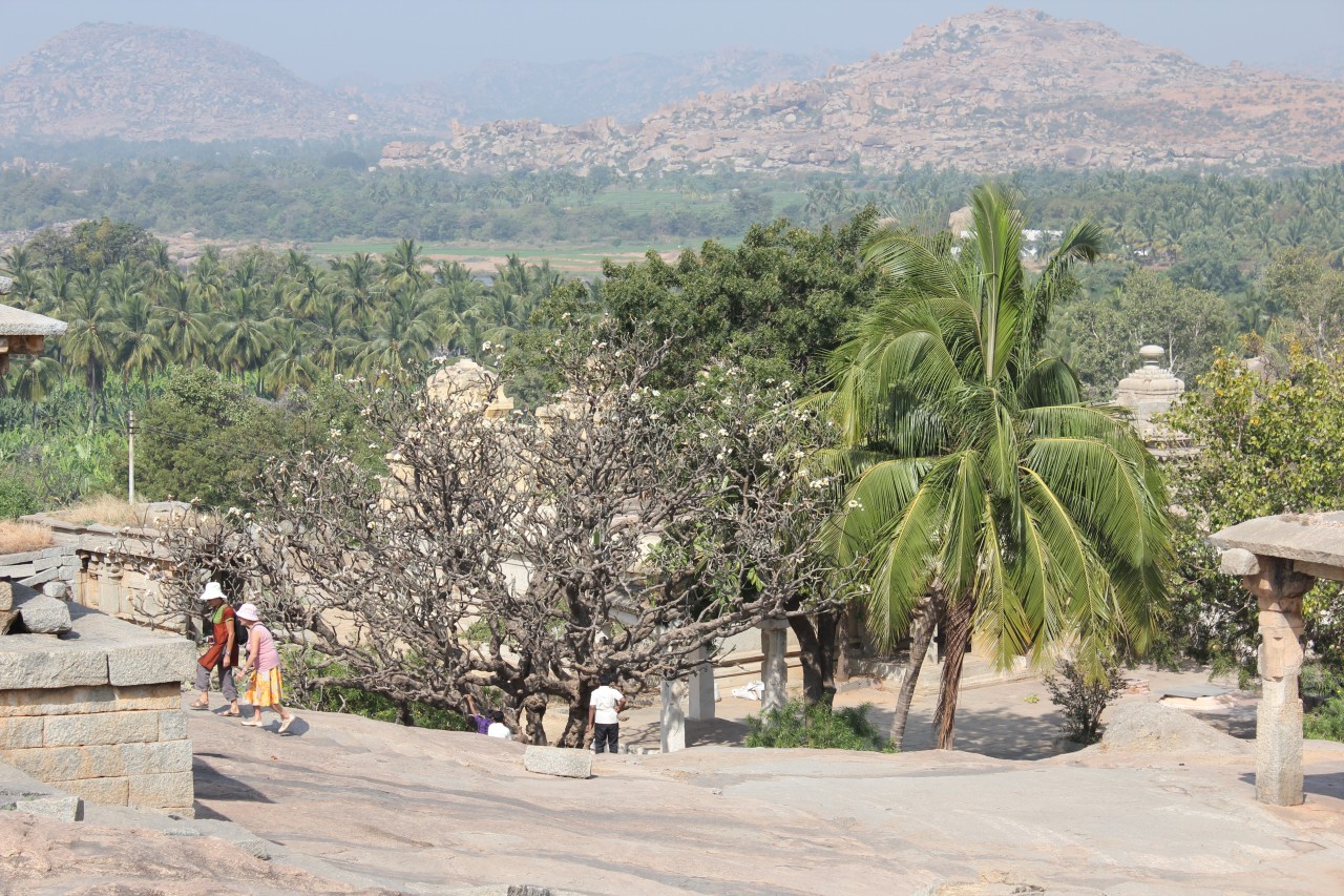 Több órával később, amikor már túl voltunk két fáradtsági holtponton is, a Lonely Planet által ajánlott Mango Tree étteremben ebédeltünk. Mindenkinek ajánlom aki Hampiban jár: kicsit sok a hippi, de a curry finom, van jó árnyék és a kilátás pazar a patakra és a környékbeli nagy sziklákra.