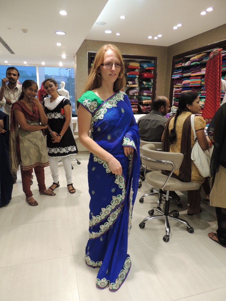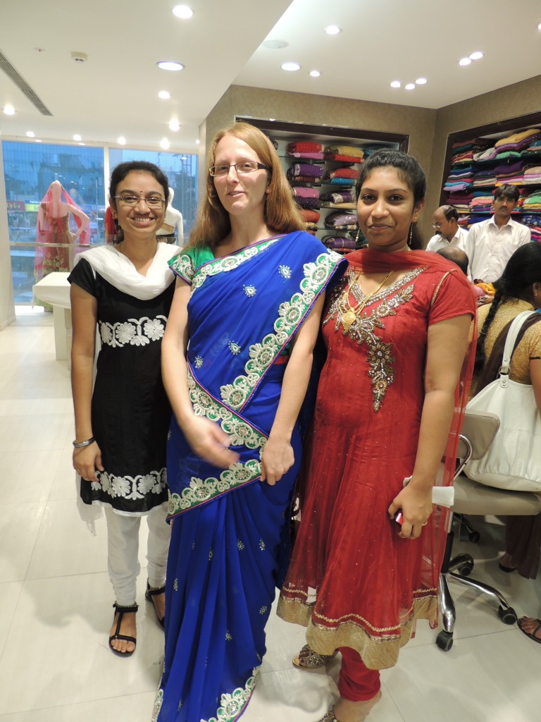 Vasárnap délután elvittek a lány munkatársak ruhát nézni. A KPHB bevásárló részre mentünk, az egyik lány férje vezetett, a dudaszóban ezen az úton sem volt hiány. Egy 4 szintes boltba tértünk be, ahol a földszinten árulták a ruha+nadrág kombókat (salwar kameez), a következő 2 szinten különböző minőségű szárik (indiai női viselet) sorakoztak a polcokon (még egy szint volt a férfiaknak). Itt úgy zajlik a vásárlás, hogy a vevőt leültetik egy pulthoz és az eladók elkezdik hozni az összehajtogatott ruhákat, amiket egy ügyes mozdulattal kilendítenek a pult fölé, így látszik a teljes ruha. Tanulnak az alapján, hogy mi tetszik és mi nem, próbálnak az ember kedvében járni. Vettem végül egy ruhát, kicsit át kell szabni a szoknya részét, mert itt nadrággal hordják a ruhákat, én meg anélkül fogom. A száris részlegen is jártunk, választottam is egy szépet, amit becsülettel körém is tekertek. Kis magyarázat: a szári igazából egy kis felsőrészből, valamint egy 6 méter hosszú anyagból áll, amit nagyon ügyesen magukra tekernek a nők. Nagyon szép volt az a szári, de nem tudnám mikor hordani, meg hát felvenni sem olyan egyszerű, így azt végül nem vettem meg. (Andris: ez hiba volt, nagy hiba.)