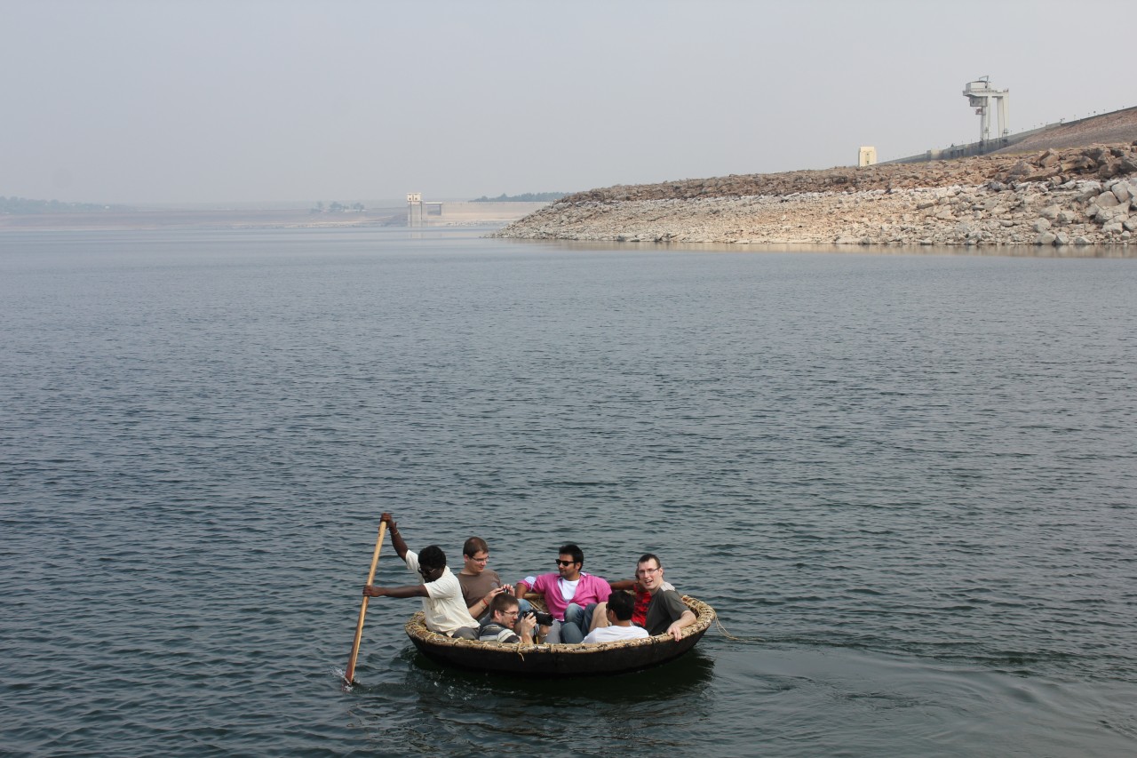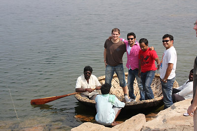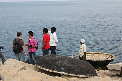Amíg vártunk a hajó indulásra lesétáltunk a vízpartra, itt fura kerek ladikokkal lehetett kimenni kicsit a vízre. Érdekes mozdulatokkal evezett a fickó, és így teljesen egyenesen haladtak a part mentén. Természetesen a ladikos bemutatta az előre evezős trükköt, elég gyorsan forgott a ladik a munkatársakkal, akik természetesen nagyon élvezték.