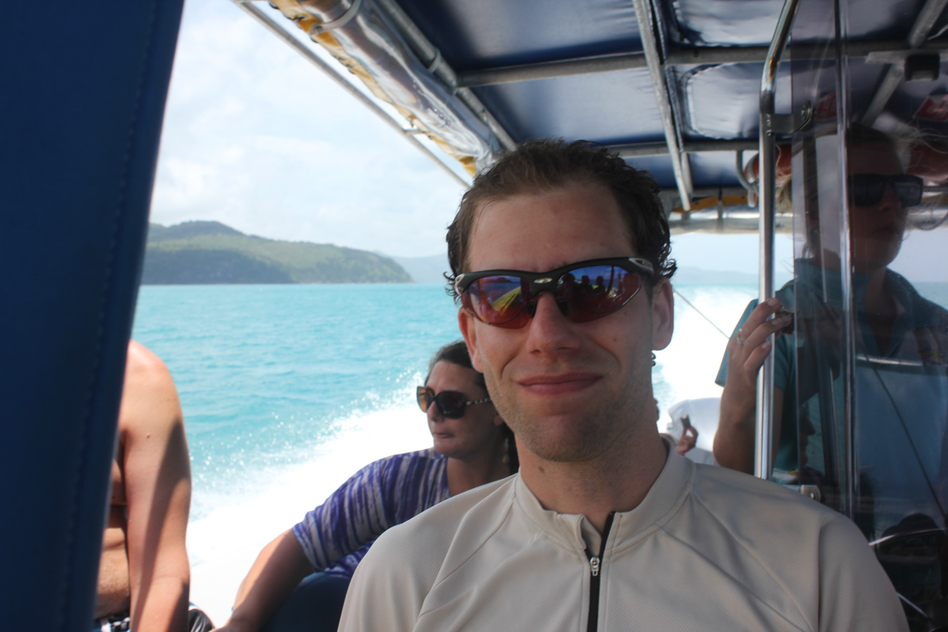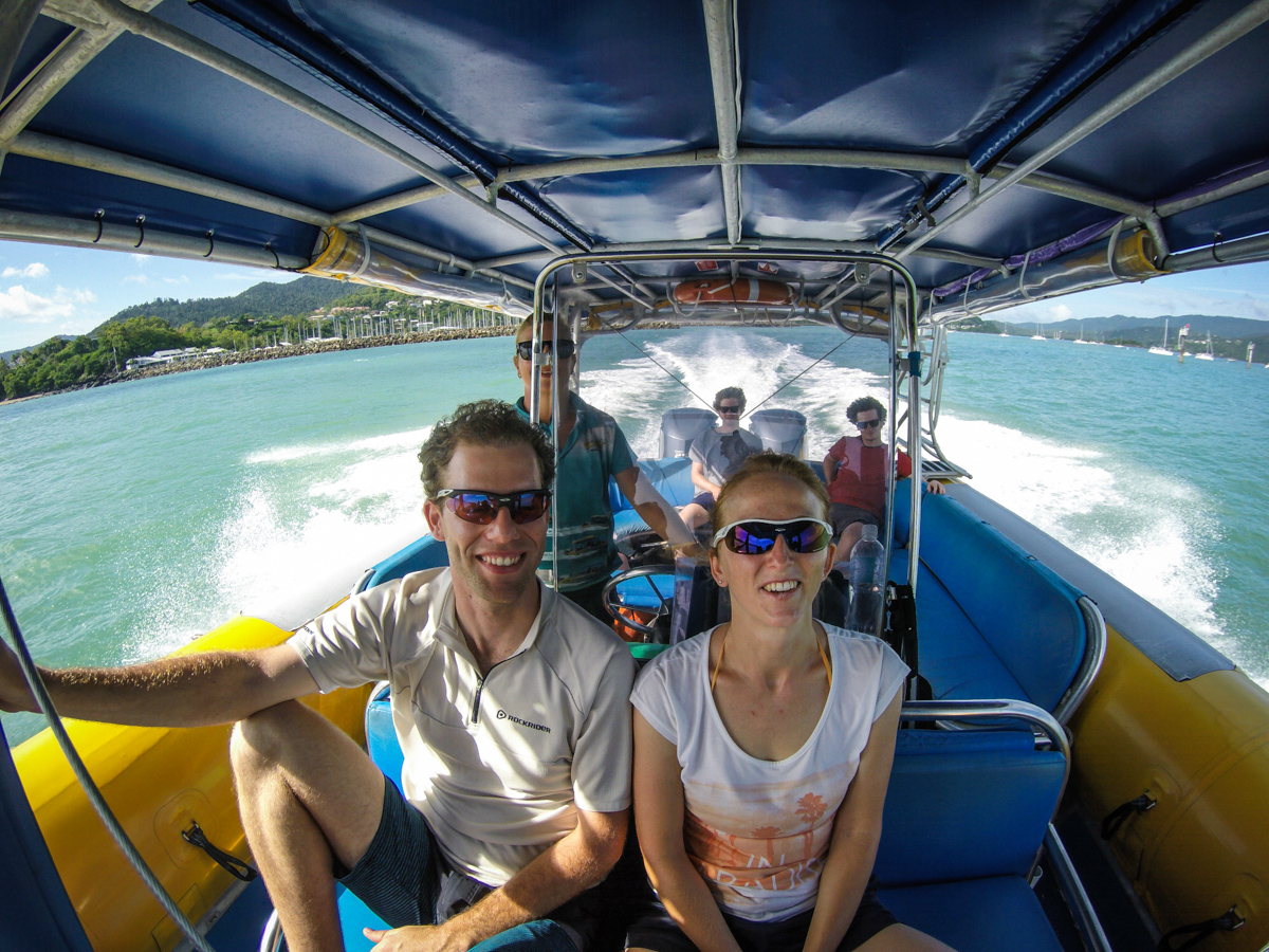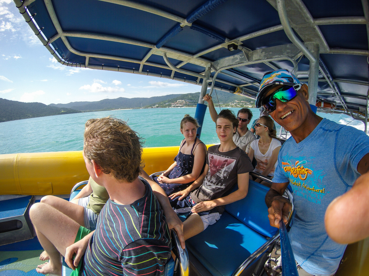 Második sznorkelezős túrán a nagy hajót kicsire cseréltük. Egy 25 fős 500 lóerős motorcsónakkal mentünk ki a Hook szigethez sznorkelezni, sajnos a sok esőzés és a magas árapály miatt nem volt tökéletes a víz tisztasága. Ilyenkor kell neki egy 3-4 nap, mire kitisztul. Ennek ellenére megint láttunk teknőst, nagy halakat is, illetve rengeteg apró színes halat és korallt. Szerencsére nem voltak medúzák, jobban élveztük mint a Lady Musgrave lagúnában. A víz alatti felvételeket Will készítette, aki útközben is szórakoztatott minket. Pont olyan, ahogy a kép alapján elképzelitek, legyen elég annyi, hogy az ‘I need a dollar’ című számmal indította a hajón a zenét.