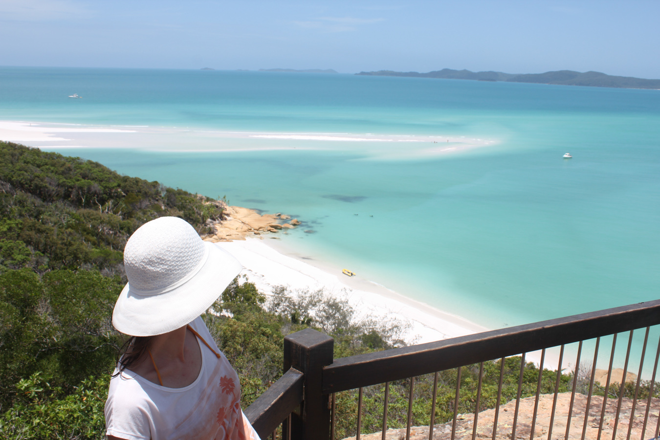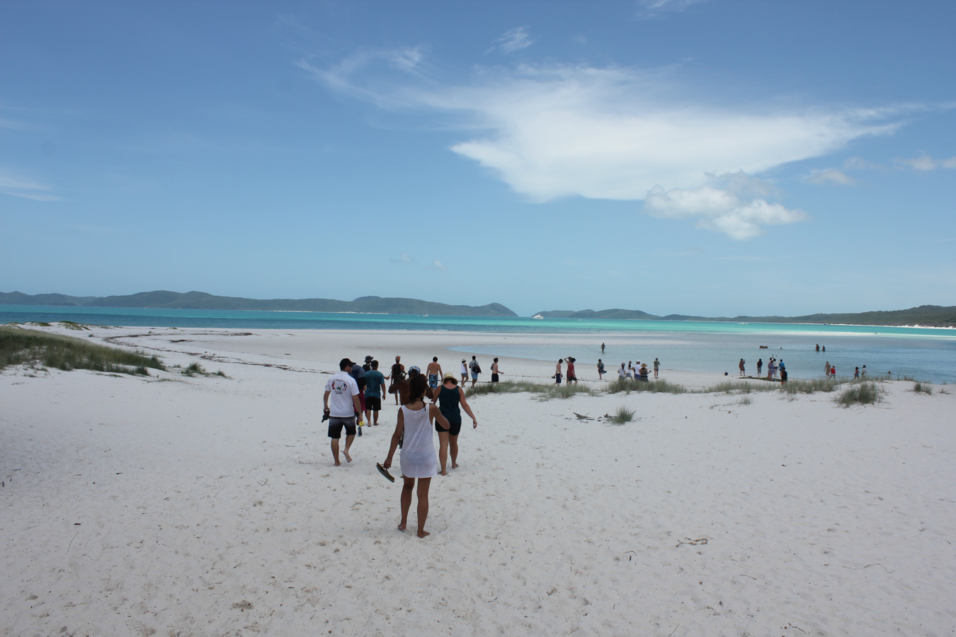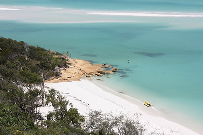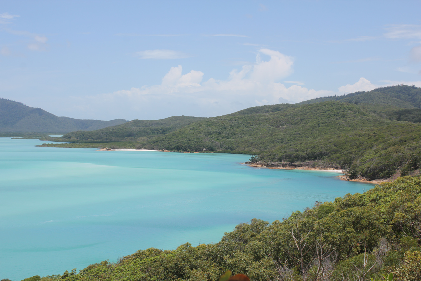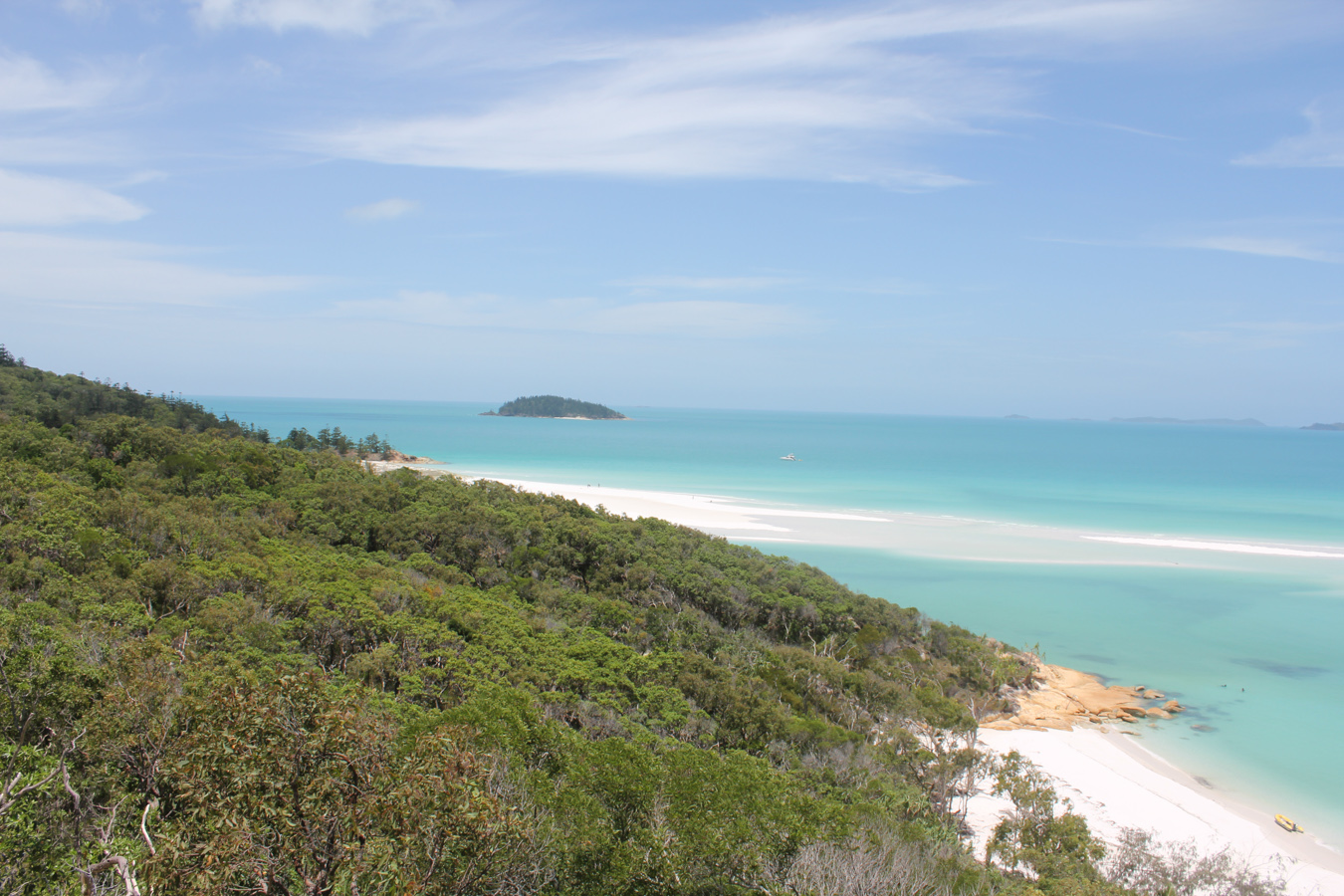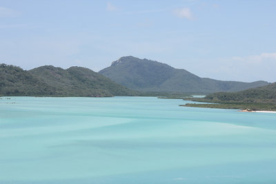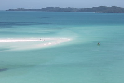Az úszós részt a strandolós követte, a Hook szigetet elhagytuk és a Whitsundayen (a legnagyobb sziget) kikötöttünk a Hill Inlet Lookouthoz. Nagyon jó volt, hogy egy hátsó öbölből mentünk fel a kilátóba, így először fentről láttuk meg a Whitehaven Beachet és a hosszú keskeny öblöt. Nagyon tiszta kvarchomok az egész, így a homok egyáltalán nem volt meleg és jó volt a tapintása is. A parton ebédeltünk, majd több mint egy órát sétáltunk a sekély vízben. Egy csomó kis cápát láttunk (veszélytelenek), ráják is vannak, de sajnos abba nem botlottunk bele.