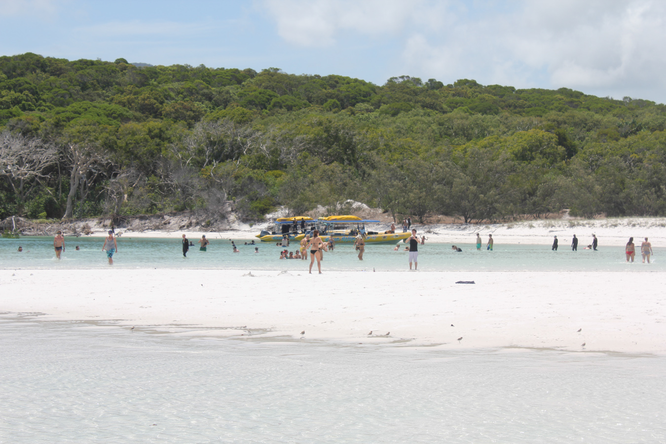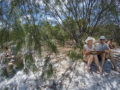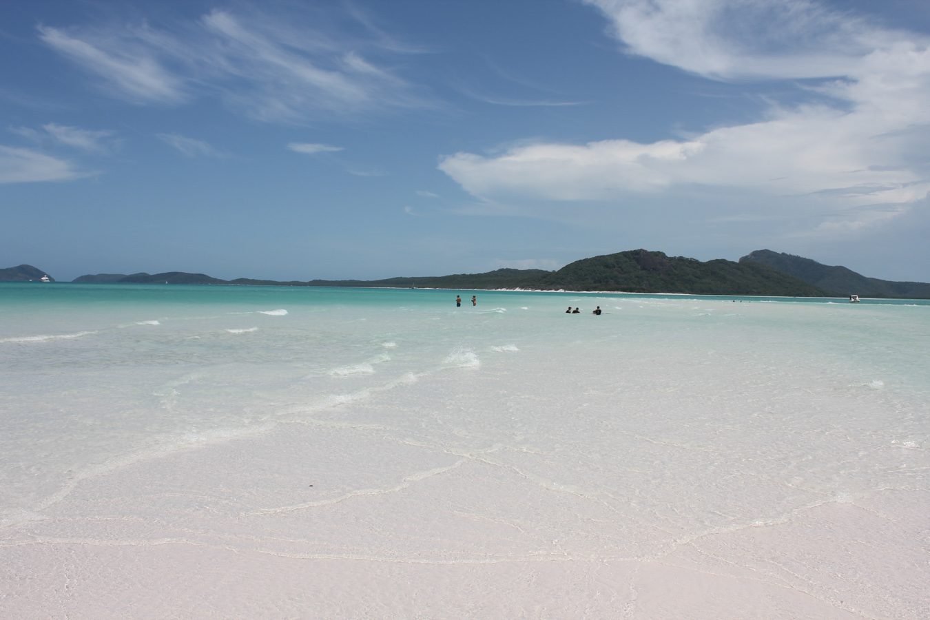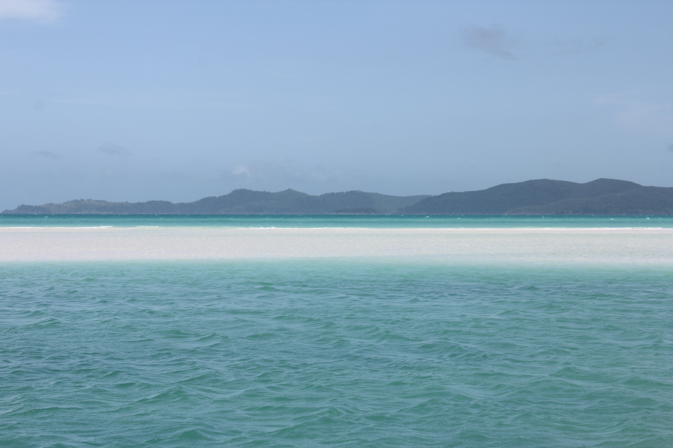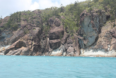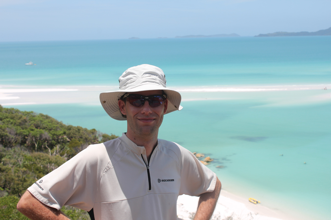 Az úszós részt a strandolós követte, a Hook szigetet elhagytuk és a Whitsundayen (a legnagyobb sziget) kikötöttünk a Hill Inlet Lookouthoz. Nagyon jó volt, hogy egy hátsó öbölből mentünk fel a kilátóba, így először fentről láttuk meg a Whitehaven Beachet és a hosszú keskeny öblöt. Nagyon tiszta kvarchomok az egész, így a homok egyáltalán nem volt meleg és jó volt a tapintása is. A parton ebédeltünk, majd több mint egy órát sétáltunk a sekély vízben. Egy csomó kis cápát láttunk (veszélytelenek), ráják is vannak, de sajnos abba nem botlottunk bele.