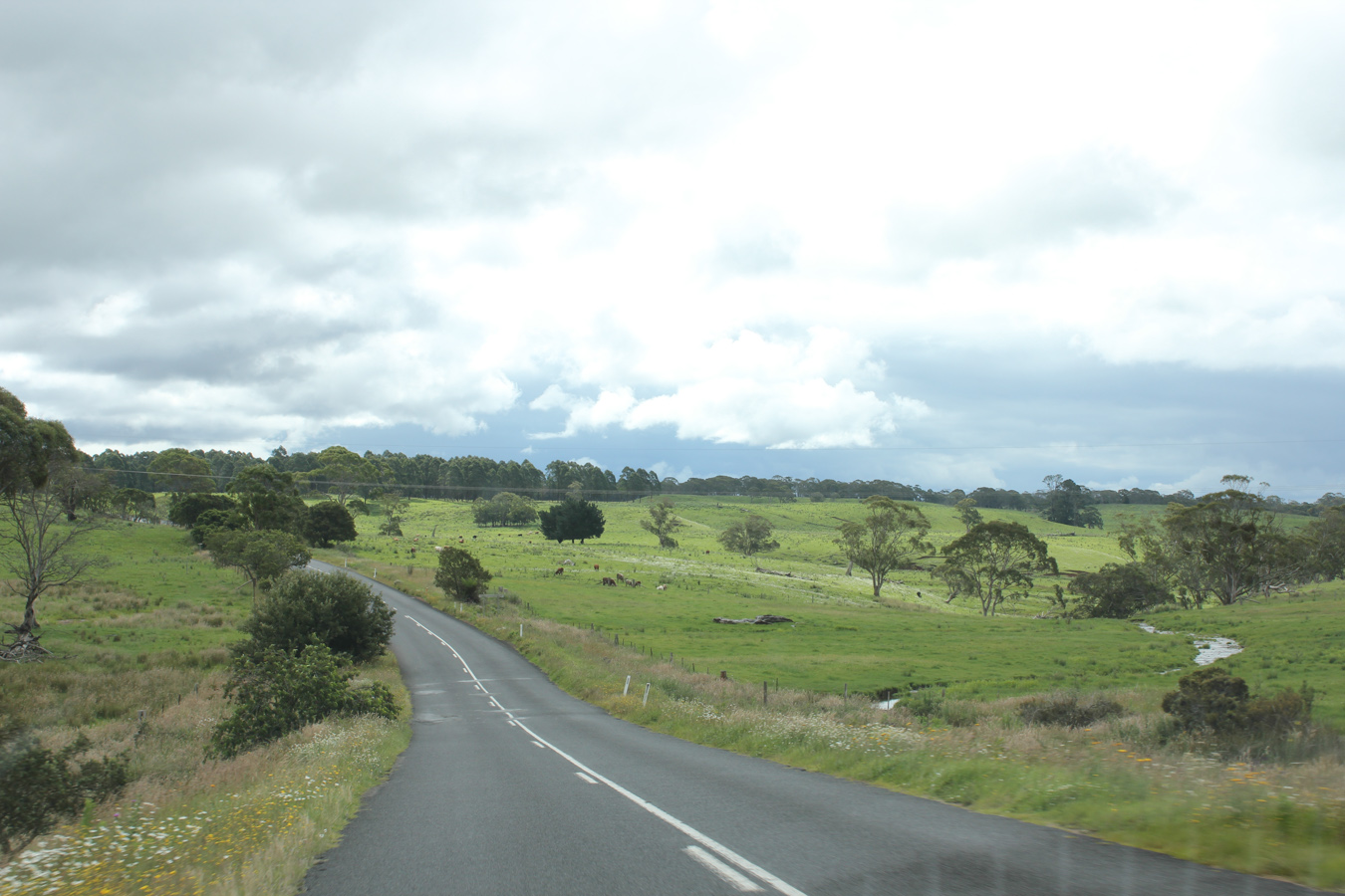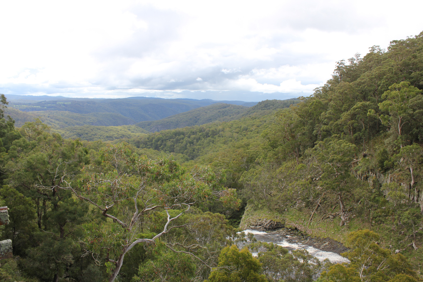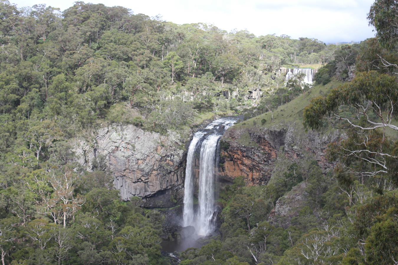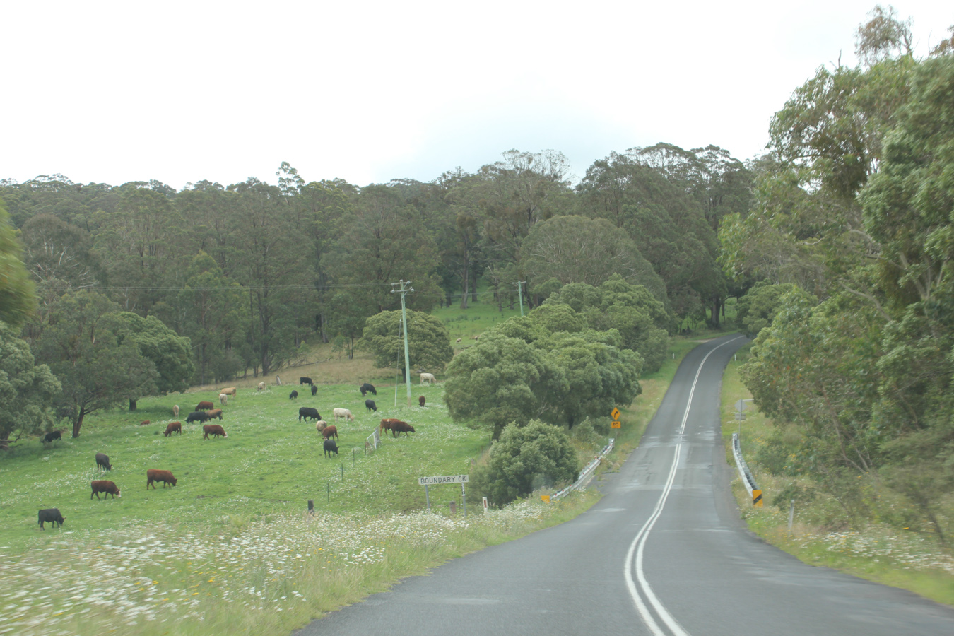 Ausztrália egyik legszebb autósturista útján jártunk, a Vízesések Útján. Otthagytuk a tengerparti esős időt és reménykedtünk benne, hogy a hegyek mögötti fennsíkon talán jobb idő lesz. Nem volt, az első kilátónál olyan köd fogadott, hogy 10m-re sem lehetett látni, nemhogy több kilométerre. Kicsit elkeseredve ugyan, de tovább autóztunk a turista úton, az Ebor vízesés felé. Arrafelé már szerencsére felszakadozott a felhőzet és láthattuk a marhákat legelni a dimbes-dombos tájon :).